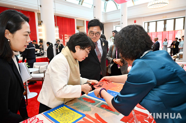 [하얼빈=신화/뉴시스] 우원식 국회의장 내외가 7일(현지 시간) 중국 헤이룽장성 하얼빈에서 열리는 만찬에 앞서 전시 중인 문화유산을 둘러보고 있다. 만찬은 제9회 동계 아시안게임 개막식에 참석한 각국 귀빈들을 위해 시진핑 중국 국가 주석이 주최했다. 2025.02.08.