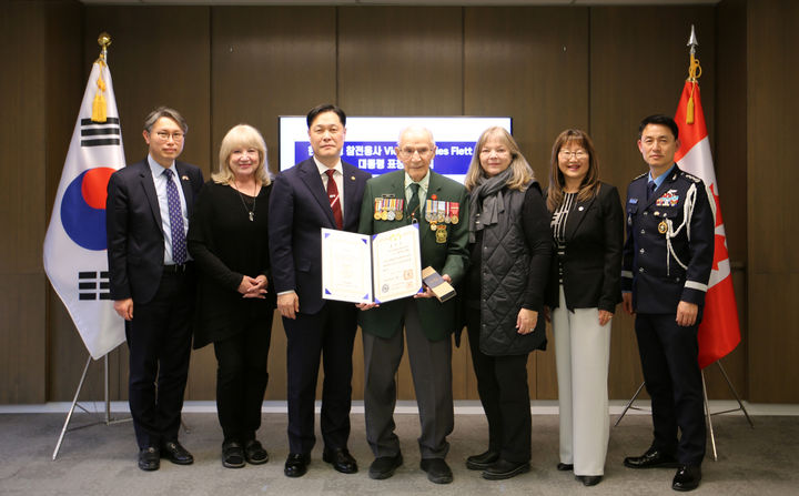 [서울=뉴시스] 김명년 기자 = 세계 상이군인 체육대회인 ‘2029 인빅터스 게임’ 유치 활동을 위해 캐나다를 방문한 이희완 국가보훈부 차관이 7일(현지 시간) 주밴쿠버대한민국영사관에서 빅터 찰스 플랫 캐나다 6·25전쟁 참전용사에게 ‘2024년 유엔군 참전의 날 유공’ 대통령 표창을 전수하고 있다.(사진=국가보훈부 제공) 2025.02.08. [email protected] *재판매 및 DB 금지
