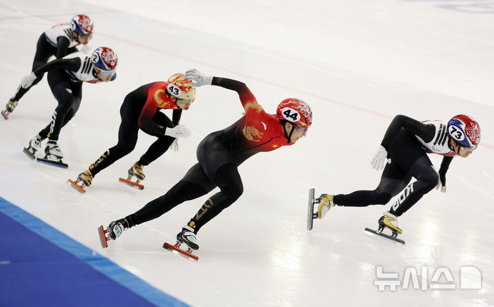 [하얼빈(중국)=뉴시스] 김선웅 기자 = 8일(현지 시간) 중국 하얼빈 헤이룽장 빙상훈련센터에서 열린 2025 하얼빈 동계 아시안게임 쇼트트랙 남자 500m 결승 경기에서 선수들이 질주하고 있다. 2025.02.08. [email protected]