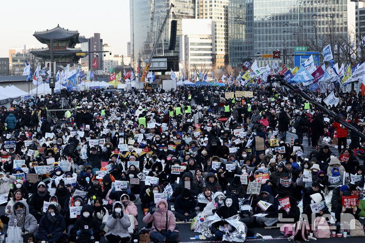 [서울=뉴시스] 김명년 기자 = 8일 오후 서울 종로구 경복궁역 인근에서 ‘제10차 윤석열 즉각 퇴진! 사회대개혁! 범시민대행진’ 집회가 열리고 있다. 2025.02.08. [email protected]