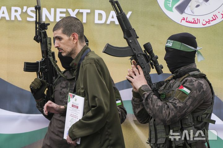 [데이르알발라=AP/뉴시스] 8일(현지 시간) 가자지구 데이르 알발라에서 하마스 무장대원들이 이스라엘인 인질 오르 레비(34)를 적십자에 인도하기 전 무대에 올리고 있다. 이스라엘과 하마스 간 휴전 협정에 따라 이날 하마스는 이스라엘 인질 3명을 석방했고, 이스라엘은 팔레스타인 수감자 183명을 풀어줬다. 2025.02.09.