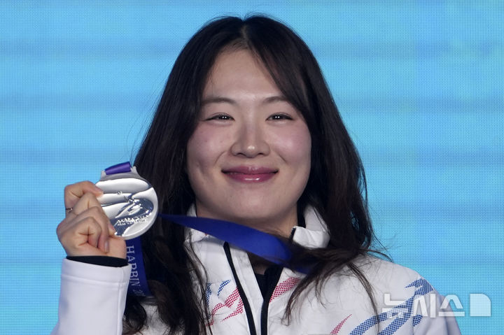 [하얼빈=AP/뉴시스] 김소희가 8일(현지 시간) 중국 헤이룽장성 하얼빈의 야부리 스키리조트에서 열린 2025 동계아시안게임 알파인스키 여자 회전 시상식에서 은메달을 들고 포즈를 취하고 있다. 김소희는 결선에서 1,2차 시기 합계 1분34초06의 기록으로 은메달을 목에 걸었다. 2025.02.09.