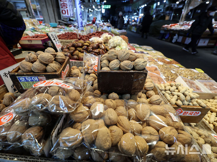 [서울=뉴시스] 이영환 기자 = 정월대보름을 사흘 앞둔 9일 오전 서울 동대문구 경동시장에서 호두, 땅콩 등 부럼이 판매되고 있다. 2025.02.09. [email protected]