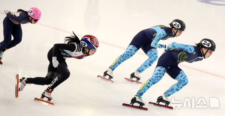 [하얼빈(중국)=뉴시스] 김선웅 기자 = 9일(현지 시간) 중국 하얼빈 헤이룽장 빙상훈련센터에서 열린 2025 하얼빈 동계 아시안게임 쇼트트랙 여자 1000m 준준결승 경기에서 최민정이 질주하고 있다. 2025.02.09. [email protected]