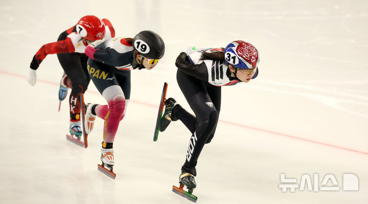 [하얼빈(중국)=뉴시스] 김선웅 기자 = 9일(현지 시간) 중국 하얼빈 헤이룽장 빙상훈련센터에서 열린 2025 하얼빈 동계 아시안게임 쇼트트랙 여자 1000m 준준결승 경기에서 심석희가 질주하고 있다. 2025.02.09. [email protected]