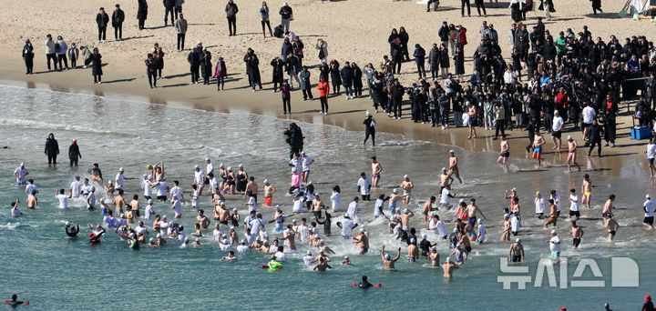 [부산=뉴시스] 하경민 기자 = '제38회 부산 북극곰 축제'가 열린 9일 부산 수영구 광안리해수욕장에서 시민과 관광객 등 인간 북극곰들이 차가운 겨울바다에 뛰어들고 있다. 2025.02.09. [email protected]