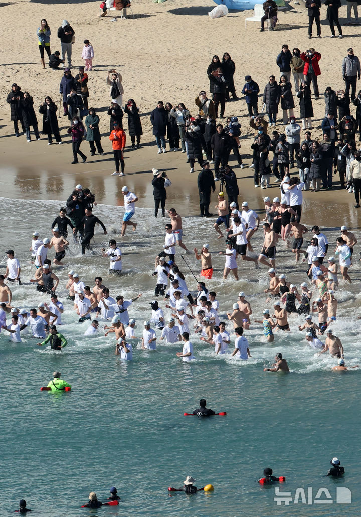 [부산=뉴시스] 하경민 기자 = '제38회 부산 북극곰 축제'가 열린 9일 부산 수영구 광안리해수욕장에서 시민과 관광객 등 인간 북극곰들이 차가운 겨울바다에 뛰어들고 있다. 2025.02.09. [email protected]