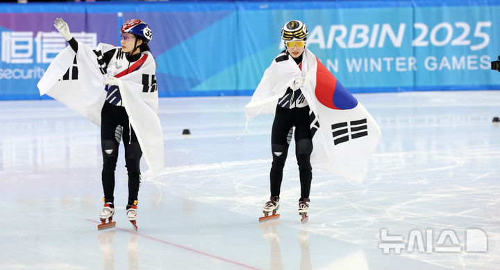 [하얼빈(중국)=뉴시스] 김선웅 기자 = 9일(현지 시간) 중국 하얼빈 헤이룽장 빙상훈련센터에서 열린 2025 하얼빈 동계 아시안게임 쇼트트랙 여자 1000m 결승 경기에서 금메달을 차지한 최민정과 은메달을 차지한 김길리가 태극기를 들고 기뻐하고 있다. 2025.02.09. [email protected]