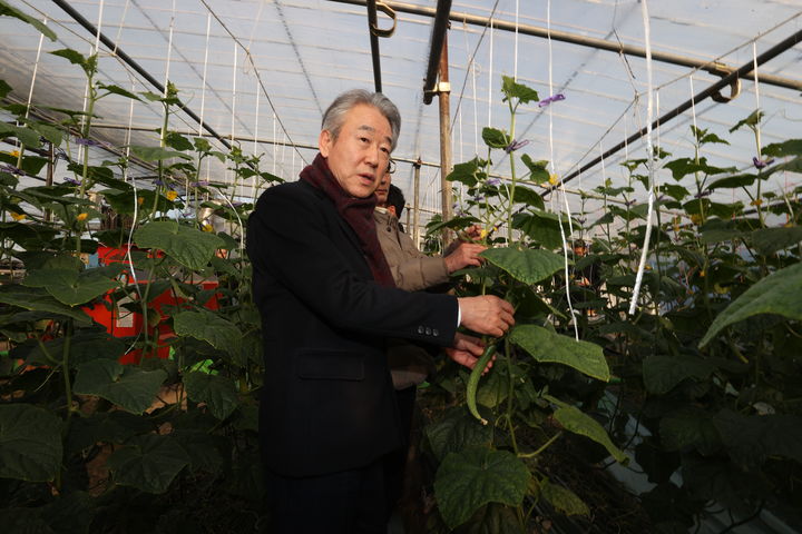 [서울=뉴시스] 강호동 농협중앙회장은 8일 전남 순천시에 위치한 오이 재배 농가를 찾아 생육·출하 상황을 점검하고 농업인들의 애로사항을 청취했다. (사진=농협) 2025.02.09. [email protected] *재판매 및 DB 금지