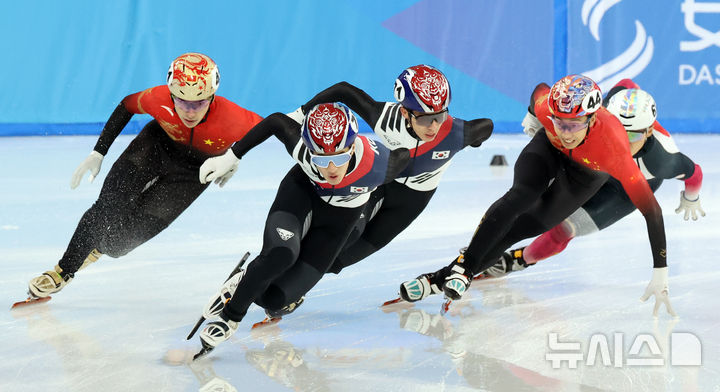 [하얼빈(중국)=뉴시스] 김선웅 기자 = 9일(현지 시간) 중국 하얼빈 헤이룽장 빙상훈련센터에서 열린 2025 하얼빈 동계 아시안게임 쇼트트랙 남자 1000m 결승 경기에서 장성우가 질주하고 있다. 2025.02.09. [email protected]