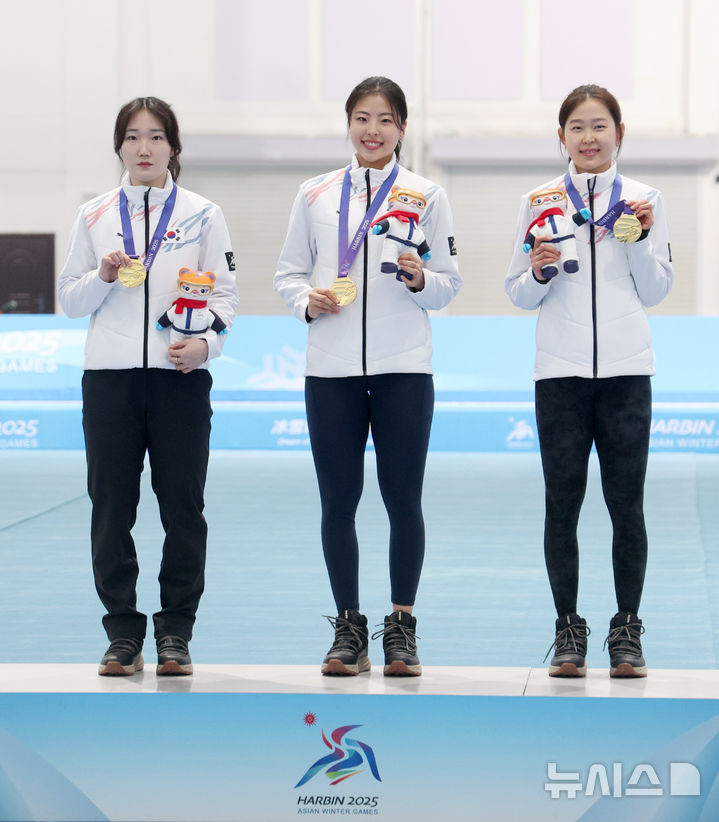 [하얼빈(중국)=뉴시스] 김선웅 기자 = 9일(현지 시간) 중국 하얼빈 헤이룽장 스피드스케이팅 오벌에서 열린 2025 하얼빈 동계 아시안게임 스피드스케이팅 여자 팀스프린트 경기 시상식에서 대한민국 김민지, 이나현, 김민선이 금메달을 수상하고 있다. 2025.02.09. [email protected]