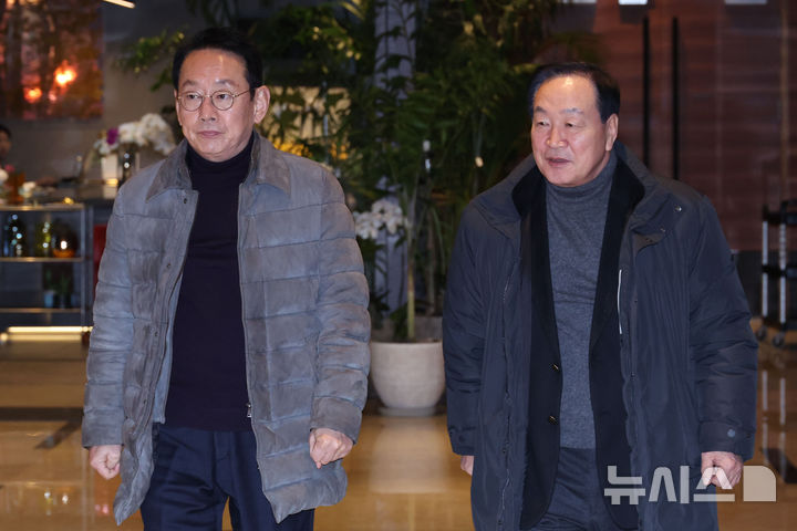 [서울=뉴시스] 권창회 기자 = 김도읍(왼쪽), 한기호 국민의힘 의원이 9일 오후 서울 여의도 한 식당에서 권영세 비상대책위원장과 중진의원들의 비공개 회동을 위해 이동하고 있다. 2025.02.09. [email protected]