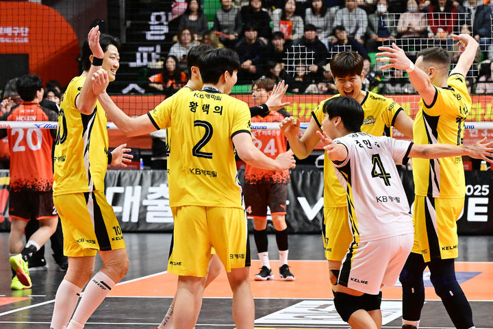 [서울=뉴시스] 황준선 기자 = 9일 경기 안산시 상록수체육관에서 열린 도드람 2024~2025 V-리그 남자부 KB손해보험과 OK저축은행의 경기, 세트스코어 3-0으로 승리한 KB손해보험 선수들이 자축하고 있다. (사진= 한국배구연맹 제공) 2025.02.09. [email protected] *재판매 및 DB 금지
