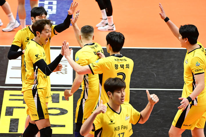 [서울=뉴시스] 황준선 기자 = 9일 경기 안산시 상록수체육관에서 열린 도드람 2024~2025 V-리그 남자부 KB손해보험과 OK저축은행의 경기, KB손해보험 선수들이 득점한 뒤 기뻐하고 있다. (사진= 한국배구연맹 제공) 2025.02.09. [email protected] *재판매 및 DB 금지