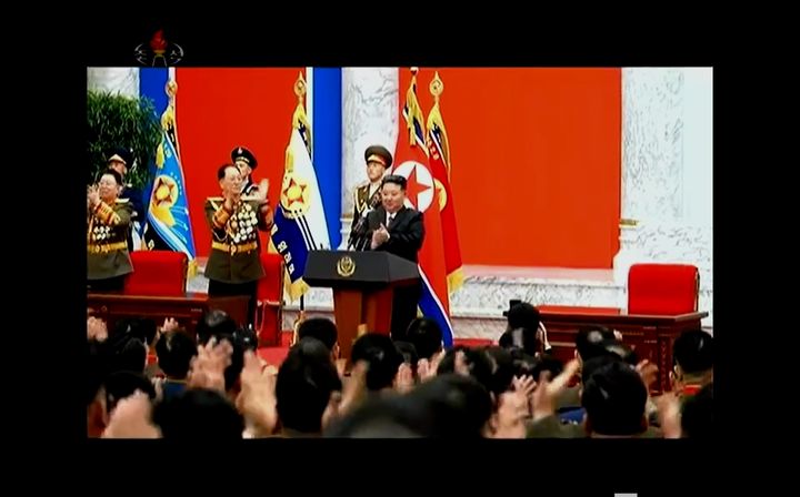 [서울=뉴시스] = 김정은 북한 국무위원장이 지난 8일 조선인민군창건(건군절) 77주년을 맞아 국방성을 축하 방문하고 장병들을 격려했다고 조선중앙TV가 9일 보도했다. (사진= 조선중앙TV 캡쳐) 2025.02.09. [email protected] *재판매 및 DB 금지