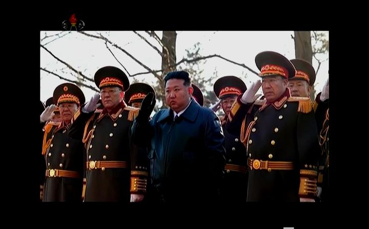 [서울=뉴시스] = 김정은 북한 국무위원장이 지난 8일 조선인민군창건(건군절) 77주년을 맞아 국방성을 축하 방문하고 장병들을 격려했다고 조선중앙TV가 9일 보도했다. (사진= 조선중앙TV 캡쳐) 2025.02.09. [email protected] *재판매 및 DB 금지