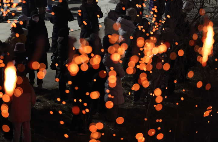 [서울=뉴시스] 황준선 기자 = 9일 밤 서울 노원구 당현천 하류 일대에서 열린 ‘2025 을사년 정월대보름 한마당’ 행사를 찾은 시민들이 낙화놀이를 지켜보고 있다. (사진=노원구청 제공) 2025.02.09. [email protected] *재판매 및 DB 금지
