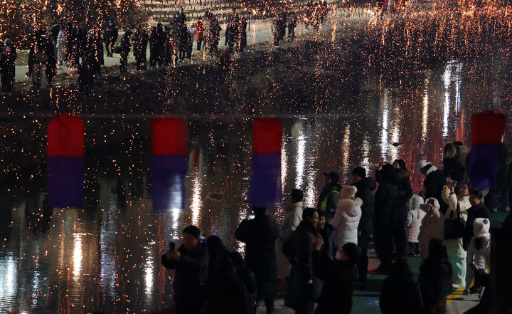 [서울=뉴시스] 황준선 기자 = 9일 밤 서울 노원구 당현천 하류 일대에서 열린 ‘2025 을사년 정월대보름 한마당’ 행사를 찾은 시민들이 낙화놀이를 지켜보고 있다. (사진=노원구청 제공) 2025.02.09. [email protected] *재판매 및 DB 금지