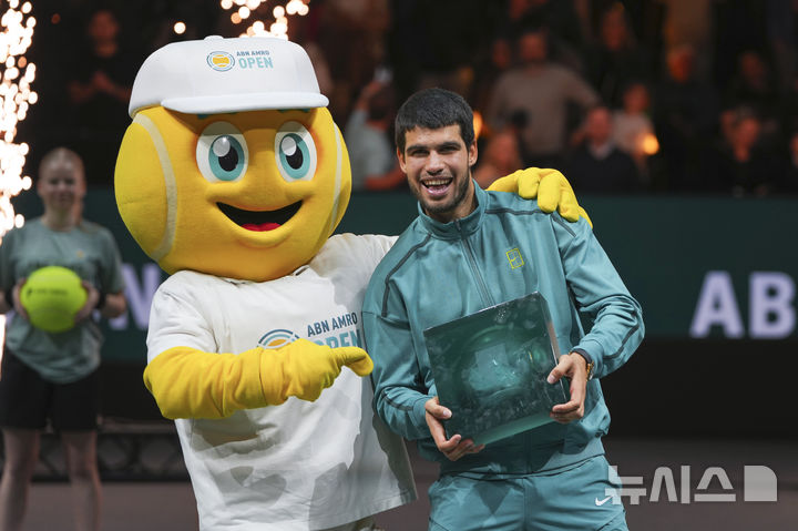 [로테르담=AP/뉴시스] 카를로스 알카라스(3위·스페인)가 9일(현지 시간) 네덜란드 로테르담에서 열린 남자프로테니스(ATP) 투어 ABN 암로오픈 단식 정상에 올라 트로피를 들고 대회 마스코트와 함께 포즈를 취하고 있다. 알카라스는 결승에서 알렉스 드미노어(8위·호주)를 2-1(6-4 3-6 6-2)로 꺾고 올해 첫 우승을 차지했다. 2025.02.10.