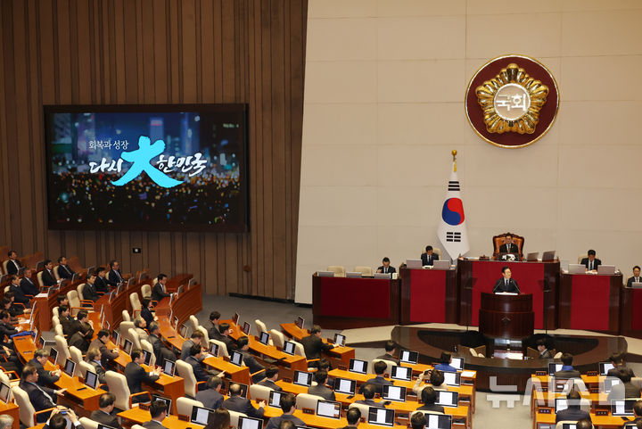 [서울=뉴시스] 고승민 기자 = 이재명 더불어민주당 대표가 10일 서울 여의도 국회에서 열린 본회의에서 교섭단체 대표연설을 하고 있다. 2025.02.10. [email protected]