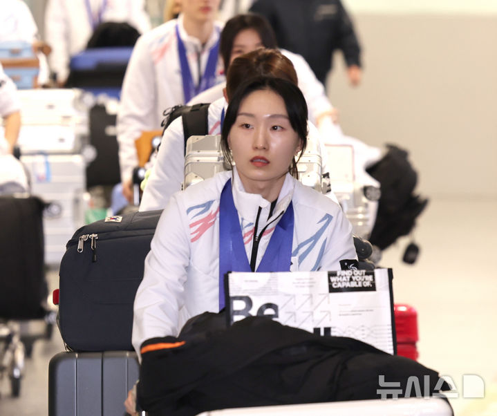 [인천공항=뉴시스] 김근수 기자 = 2025 하얼빈 동계아시안게임에서 3관왕을 차지한 쇼트트랙 최민정이 10일 인천국제공항 제1여객터미널 입국장으로 귀국하고 있다. 2025.02.10. [email protected]