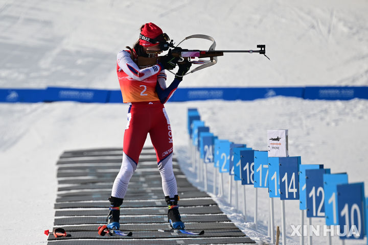 [야부리=신화/뉴시스] 러시아 출신 귀화 선수 예카테리나 아바쿠모바가 11일(현지 시간) 중국 헤이룽장성 야부리 스키리조트에서 열린 2025 하얼빈 동계아시안게임 바이애슬론 여자 7.5㎞ 스프린트 경기를 펼치고 있다. 아바쿠모바는 22분45초4의 기록으로 1위를 차지하며 한국 바이애슬론 사상 처음으로 동계아시안게임 금메달을 목에 걸었다. 2025.02.11.