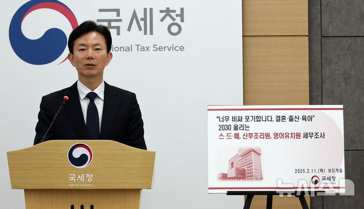 [세종=뉴시스] 강종민 기자 = 민주원 국세청 조사국장이 11일 세종시 정부세종2청사에서 2030 수요자에게 과도한 지출을 강요하면서도 각종 수법을 동원해 세금을 회피한 결혼·출산·유아교육 업체에 대한 세무조사를 실시한다고 밝히고 있다. 2025.02.11. [email protected]