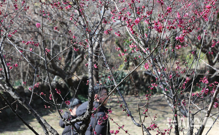 [서귀포=뉴시스] 우장호 기자 = 맑은 날씨를 보인 11일 오후 제주 서귀포시 이중섭미술관 인근에 봄꽃인 홍매화가 활짝 피어나 지나는 이들의 시선을 끌고 있다. 2025.02.11. [email protected]