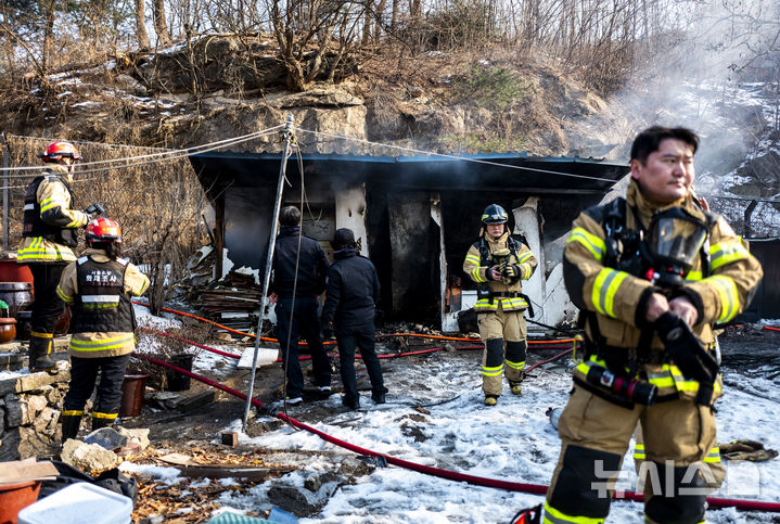 [서울=뉴시스] 정병혁 기자 = 11일 서울 서대문구 홍제동에 위치한 임시거주시설에서 원인미상의 화재가 발생해 출동한 소방대원들이 화재 진화 및 잔불 정리 작업을 하고 있다. 이날 14시 34분께 CCTV상으로 다량 검은구름을 관측한 소방대원들이 현장으로 출동해 14시 56분께 초진을 완료 한 뒤 잔불 정리 작업을 진행 중이다. 현장에 출동한 소방은 이 화재로 1명이 숨지고 1명이 부상했다고 밝혔다. 2025.02.11. [email protected]