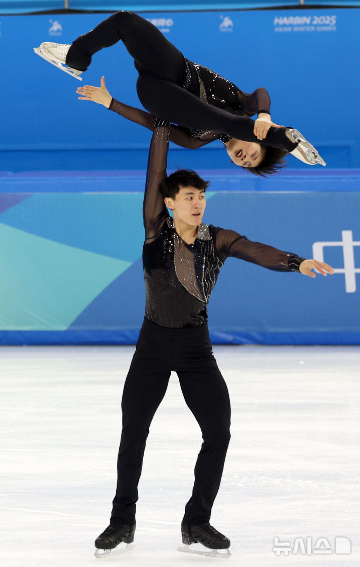[하얼빈(중국)=뉴시스] 김선웅 기자 = 11일(현지 시간) 중국 하얼빈 헤이룽장 빙상훈련센터에서 열린 2025 하얼빈 동계 아시안게임 피겨스케이팅 페어에 출전한 북한 렴대옥·한금철이 연기를 선보이고 있다. 2025.02.11. [email protected]