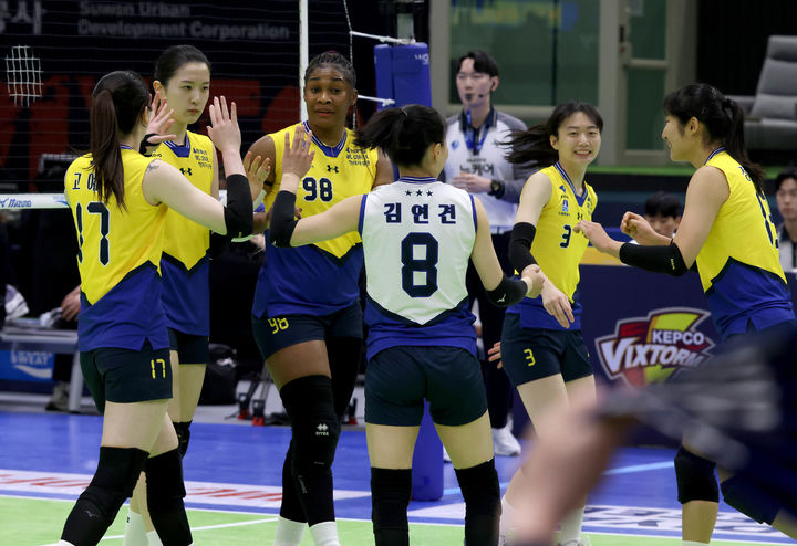 [서울=뉴시스] 홍효식 기자 = 11일 오후 수원실내체육관에서 열린 2024-2025 도드람 V-리그 여자부 현대건설과 한국도로공사의 경기, 현대건설 선수들이 득점에 기뻐하고 있다. (사진 = 현대건설 배구단 제공) 2025.02.11. [email protected] *재판매 및 DB 금지