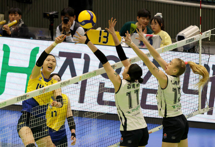 [서울=뉴시스] 홍효식 기자 = 11일 오후 수원실내체육관에서 열린 2024-2025 도드람 V-리그 여자부 현대건설과 한국도로공사의 경기, 현대건설 양효진이 공격하고 있다. (사진 = 현대건설 배구단 제공) 2025.02.11. [email protected] *재판매 및 DB 금지