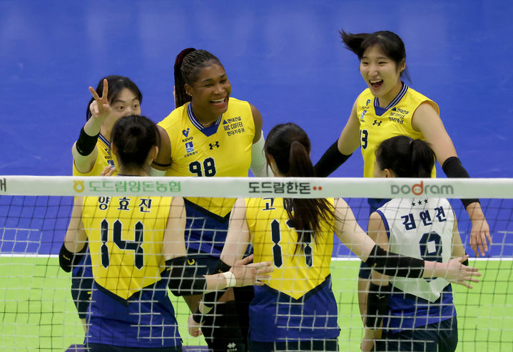[서울=뉴시스] 홍효식 기자 = 11일 오후 수원실내체육관에서 열린 2024-2025 도드람 V-리그 여자부 현대건설과 한국도로공사의 경기, 현대건설 선수들이 득점에 기뻐하고 있다. (사진 = 현대건설 배구단 제공) 2025.02.11. [email protected] *재판매 및 DB 금지