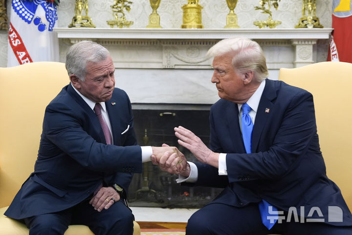 [워싱턴=AP/뉴시스] 도널드 트럼프 미국 대통령이 11일(현지 시간) 백악관 집무실에서 압둘라 2세 요르단 국왕과 회담하며 악수하고 있다. 트럼프 대통령은 압둘라 2세 국왕을 만나 가자지구에서 팔레스타인 주민들을 이주시키고, 미국이 이 지역을 소유해 개발하겠다는 의지를 재확인했다. 2025.02.12.