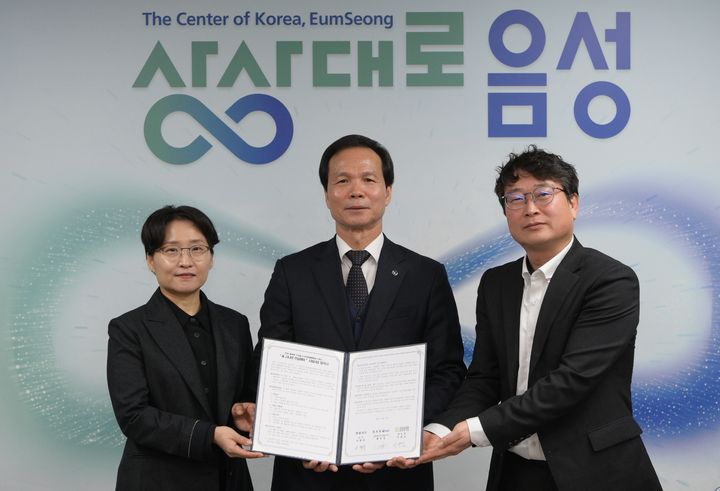 [음성=뉴시스] 12일 충북 음성군청에서 황선영(왼쪽부터) NHN(주)와플랫 대표이사, 조병옥 음성군수, 이영민 음성군통합돌봄지원센터장이 AI 시니어 안심케어 시범사업 업무협약을 맺은 뒤 기념사진을 찍고 있다. (사진=음성군 제공) 2025.2.12. [email protected]
