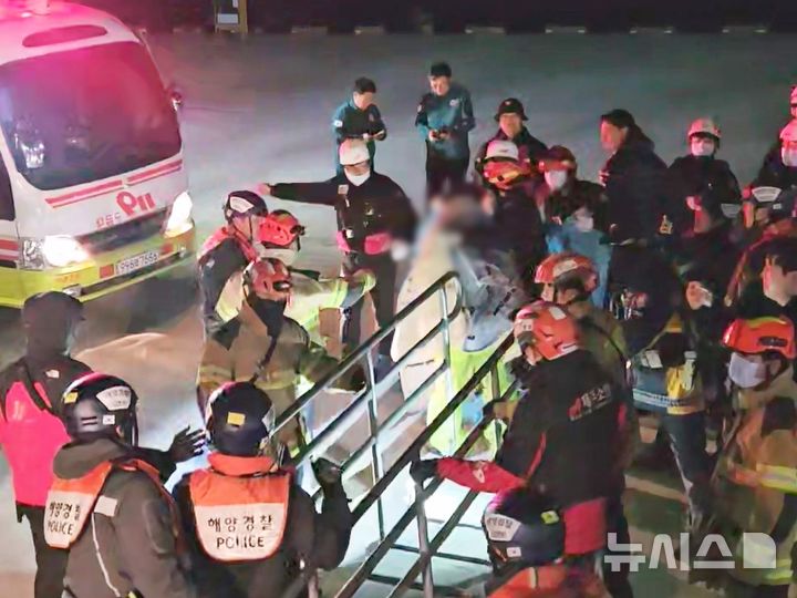 [제주=뉴시스] 12일 오후 제주 서귀포시 강정항에서 구조된 '2066재성호' 선원들이 임시의료소에 도착해 병원으로 이송되고 있다. (사진=제주지방해양경찰청 제공) 2025.02.12. [email protected]
