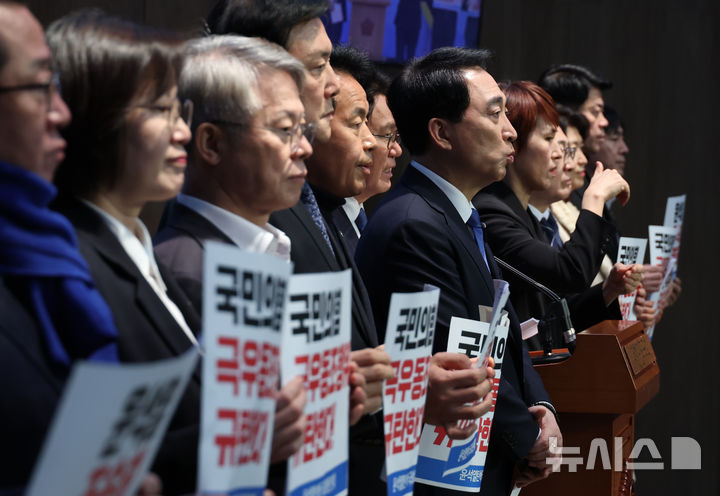 [서울=뉴시스] 고승민 기자 = 박수현 더불어민주당 의원, 황운하 조국혁신당 원내대표, 윤종오 진보당 원내대표 등 윤석열 탄핵 국회의원 연대 의원들이 12일 서울 여의도 국회 소통관에서 탄핵재판 쟁점 관련 기자회견을 하고 있다. 2025.02.10. [email protected]