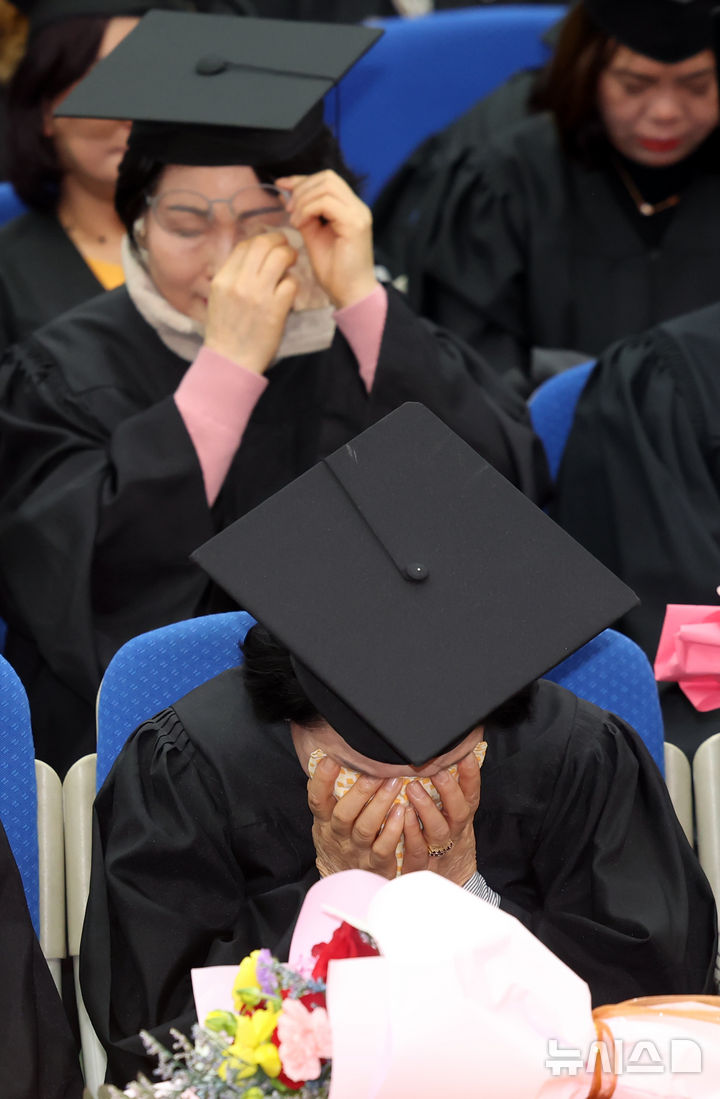 [부산=뉴시스] 하경민 기자 = 부산 부경보건고등학교와 병설 부경중학교 졸업식이 열린 12일 사하구 은항교회에서 만학도 졸업생들이 눈물을 닦고 있다.
