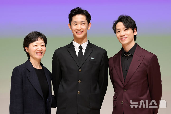 [서울=뉴시스] 박진희 기자 = 한국 발레리노 최초로 스위스 로잔 발레 콩쿠르(Prix de Lausanne·프리 드 로잔)에서 우승한 발레리노 박윤재 스승 리앙시후아이(오른쪽)가 12일 서울 종로구 서울예술고등학교 내 서울아트센터에서 기자회견을 하고 있다. 왼쪽부터 서울예고 안윤희 발레과 교사, 박윤재, 대만 출신 서울예고 교사 리앙 시후아이. 2025.02.12. [email protected]