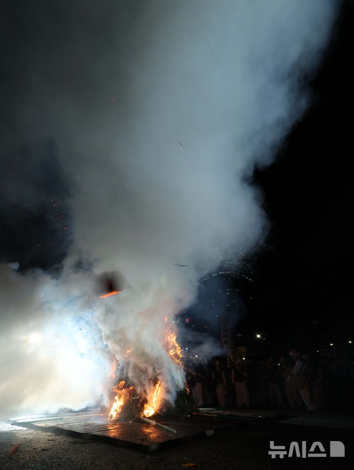 [서울=뉴시스] 고범준 기자 = 정월대보름인 12일 오후 서울 송파구 문화실험공간 호수 주차장에서 열린 2025 송파구 정월대보름 행사에서 시민들이 타오르는 달집을 바라보고 있다. 2025.02.12. [email protected]