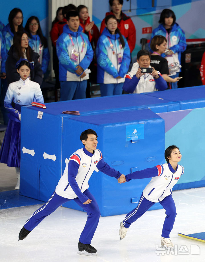 [하얼빈(중국)=뉴시스] 김선웅 기자 = 12일(현지 시간) 중국 하얼빈 헤이룽장 빙상훈련센터에서 열린 2025 하얼빈 동계 아시안게임 피겨스케이팅 페어를 마친 북한 렴대옥·한금철이 은메달을 수상하기 위해 시상대로 향하고 있다. 2025.02.12. [email protected]