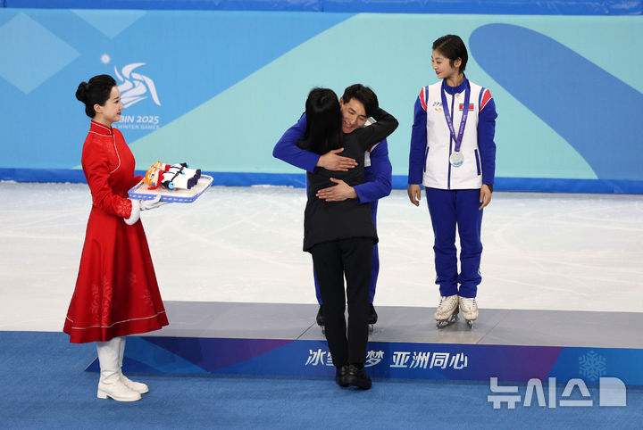 [하얼빈(중국)=뉴시스] 김선웅 기자 = 12일(현지 시간) 중국 하얼빈 헤이룽장 빙상훈련센터에서 열린 2025 하얼빈 동계 아시안게임 피겨스케이팅 페어 시상식에서 북한 렴대옥·한금철이 은메달을 수상하며 시상 관계자와 포옹하고 있다. 2025.02.12. [email protected]