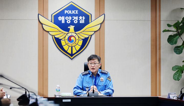 [인천=뉴시스] 전국에 해양안전 특별 경계가 발령된 가운데 13일 오후 인천 연수구 해양경찰청 중회의실에서 김용진 해양경찰청장이 긴급 전국 지휘관 화상회의를 소집하고 지휘관들에게 발언을 하고 있다. 김 청장은 지휘관들에게 현재 상황과 관련 신중하게 준비하고 단호하게 대응하라고 주문했다. (사진=해양경찰청 제공) 2025.02.13. [email protected]