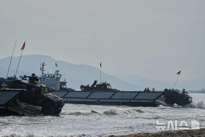 [네아 안치알로스(그리스)=AP/뉴시스]스페인 특수부대가 13일 그리스 중부 네아 안치알로스에서 '스테드패스트 다트 2025' 훈련의 일환으로 상륙 작전을 벌이고 있다. 북대서양조약기구(나토)가 미국이 유럽 방위와 우크라이나 전쟁에 대한 접근 방식을 바꾸면서 미국의 직접 지원 없이 동유럽 전역에 신속하게 배치할 수 있는 능력을 시험하고 있다. 2025.02.13.