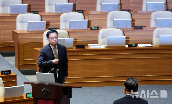 [서울=뉴시스] 조성우 기자 = 최상목 대통령 권한대행 부총리 겸 기획재정부 장관이 13일 오후 서울 여의도 국회에서 열린 제422회 국회(임시회) 제5차 본회의 경제 분야 대정부질문에서 발언대로 향하고 있다. 2025.02.13. [email protected]