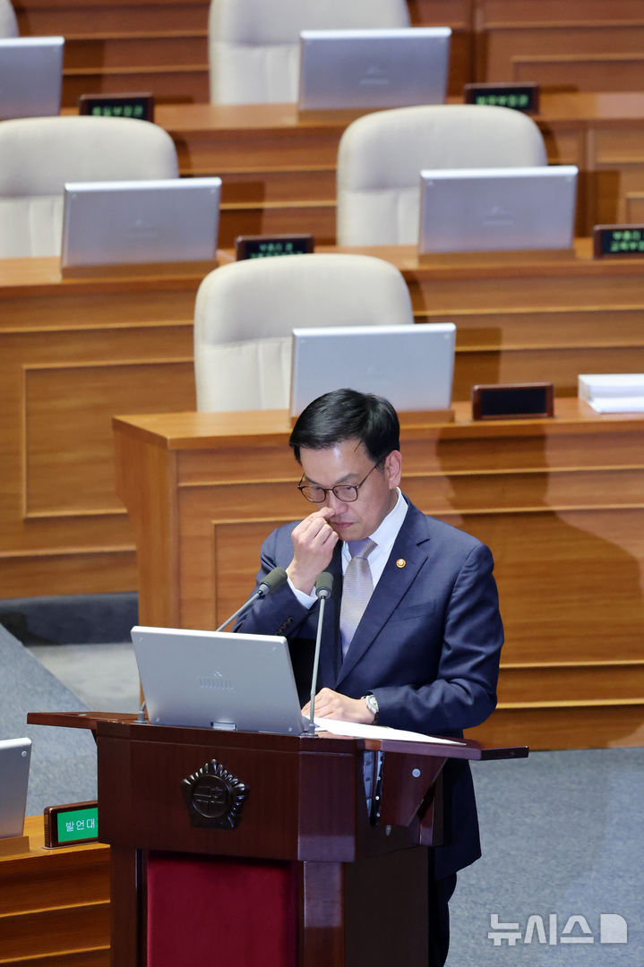 [서울=뉴시스] 조성우 기자 = 최상목 대통령 권한대행 부총리 겸 기획재정부 장관이 13일 오후 서울 여의도 국회에서 열린 제422회 국회(임시회) 제5차 본회의 경제 분야 대정부질문에서 안경을 고쳐 쓰고 있다. 2025.02.13. [email protected]