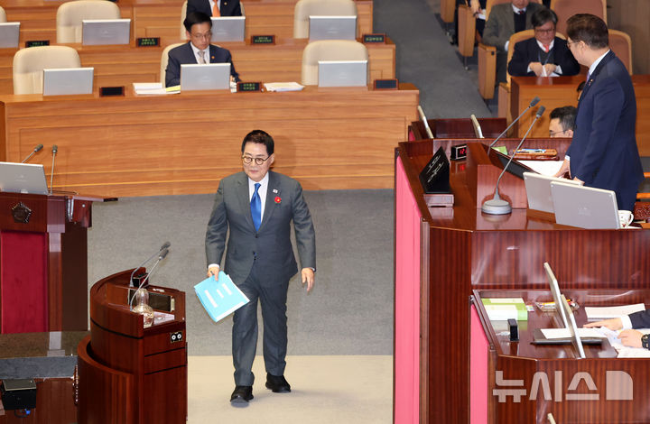 [서울=뉴시스] 조성우 기자 = 박지원 더불어민주당 의원이 13일 오후 서울 여의도 국회에서 열린 제422회 국회(임시회) 제5차 본회의 경제 분야 대정부질문에서 단상으로 향하고 있다. 2025.02.13. [email protected]