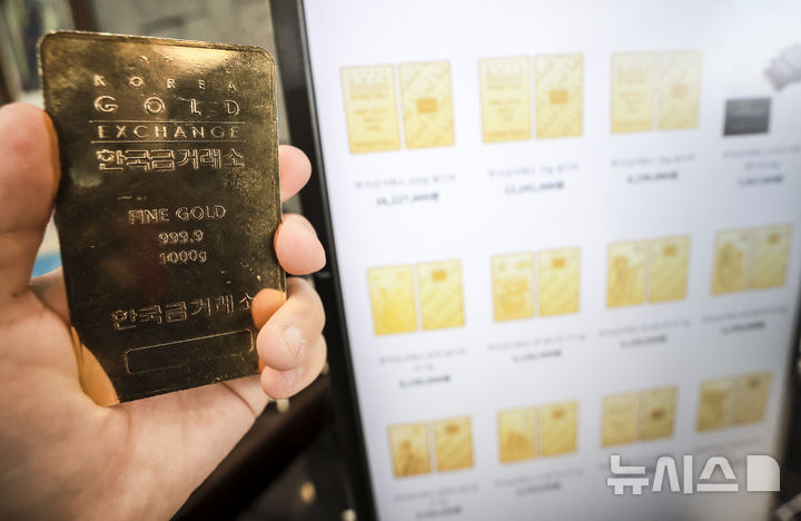 [서울=뉴시스] 정병혁 기자 = 13일 서울 종로구 한국금거래소 종로본점에 전시용 골드바가 전시되어 있다.