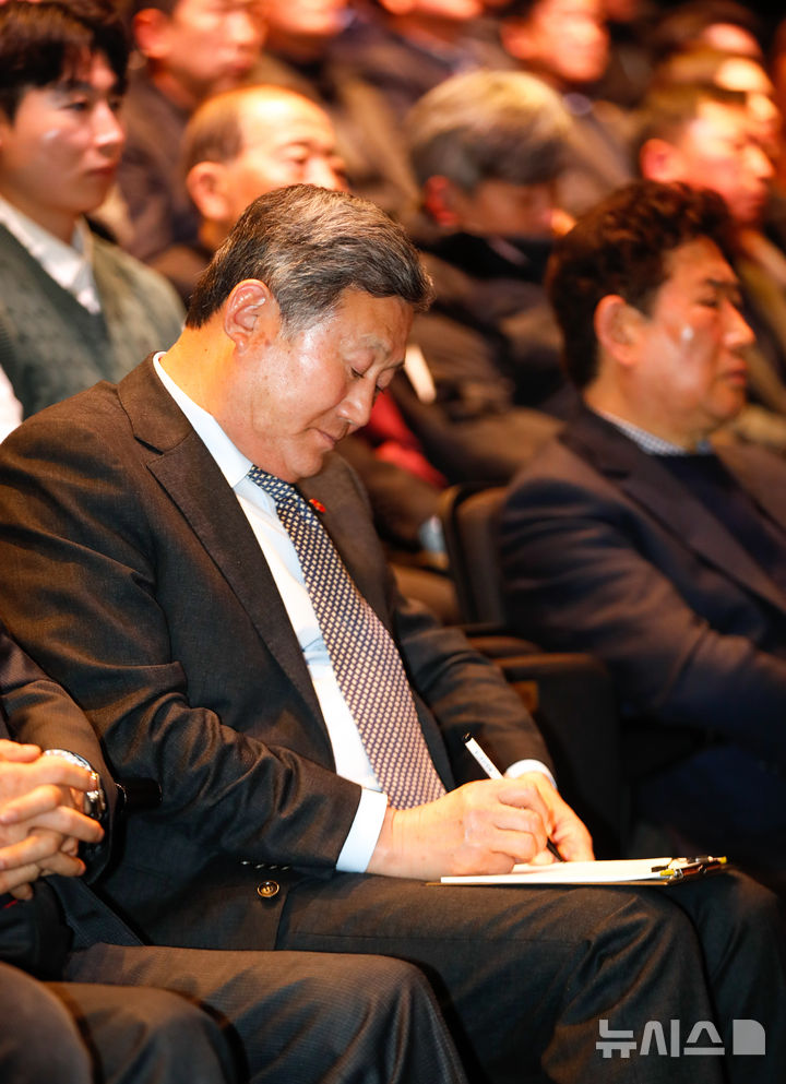 [제주=뉴시스] 우장호 기자 = 김완근 제주시장이 13일 오후 제주시 비인(BeIN;) 공연장에서 '민생안정·경제활력·미래제주를 향한 힘찬 도약'을 주제로 열린 제주지사 '2025년 연두방문' 행사에서 도민들의 건의사항을 메모하고 있다. 2025.02.13. [email protected]