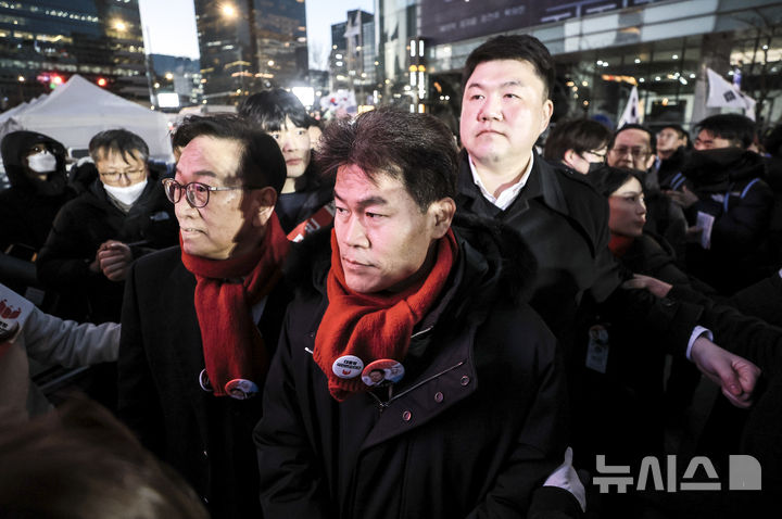 [서울=뉴시스] 정병혁 기자 = 윤석열 대통령 국민변호인단 단장인 석동현 변호사와 전한길 한국사 강사가 13일 서울 중구 청계광장에서 열린 윤석열 대통령 국민변호인단 출범식에 참석하고 있다. 2025.02.13. [email protected]